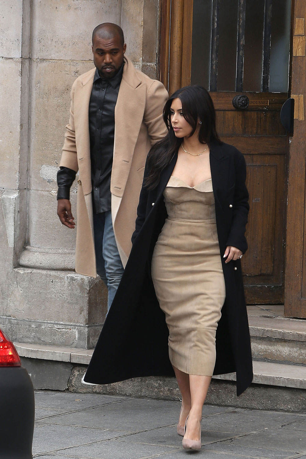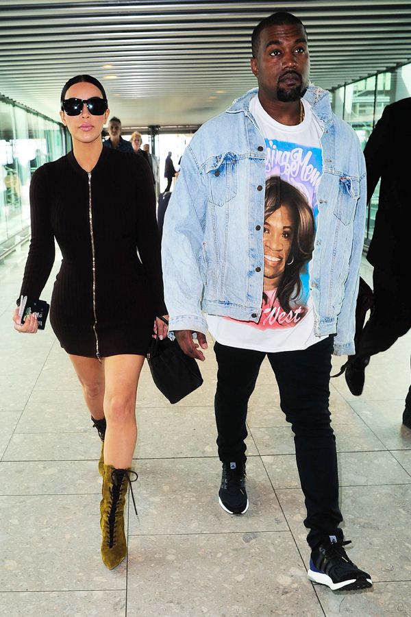 Kanye West donned a sleek, monochromatic ensemble consisting of a black tailored overcoat, matching trousers, and a turtleneck sweater. The look was completed with a pair of patent leather boots and statement sunglasses. His outfit exuded an air of sophistication and minimalism, showcasing his signature style.