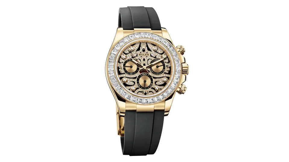 Released in 2019, the “Eye of the Tiger†Daytona features a gold 40 mm case and a black tiger-print dial set with yellow gold and diamonds. The timepiece is also adorned with diamond hour markers, yellow-gold hands, and a bezel set with 36 trapeze-cut diamonds. While the watch is designed to look like big-cat stripes (hence the nickname), it has also been referred to as the “Rorschach Test Daytona†due to its unique pattern.